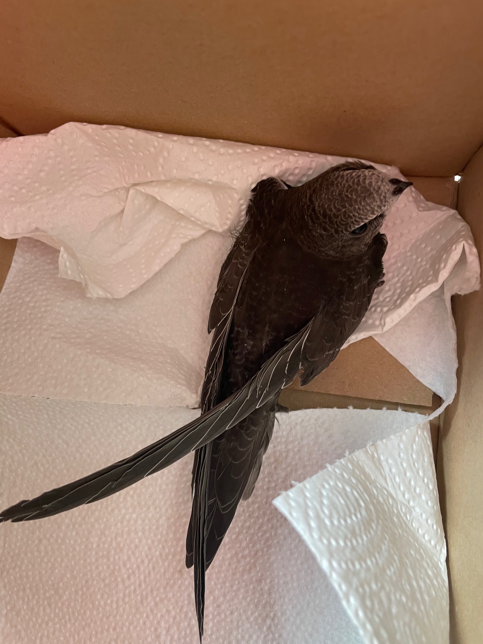 Ich holte mir eine Taschenlampe und fand einen Jungsegler , den ich zum Glück erreichen konnte , bevor er in den zu flachen Bereich des Daches entkommen konnte .