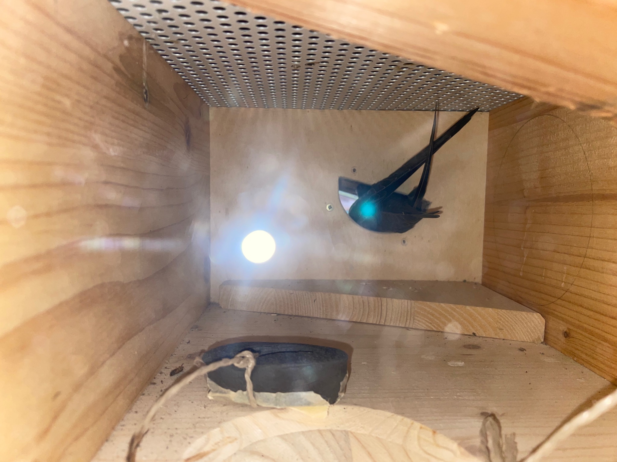 Ich hatte ihn dann in einen freien Kasten unter dem eigentlich Brutraum gesetzt und das Loch provisorisch mit etwas Dämmmaterial an einem Band verschlossen damit er nicht ev. gleich nach dem Einsetzen hinausstürmt .Da er den Schnabel weit geöffnet hatte , bekam er etwas Wasser an den unteren Schnabel gegeben.
