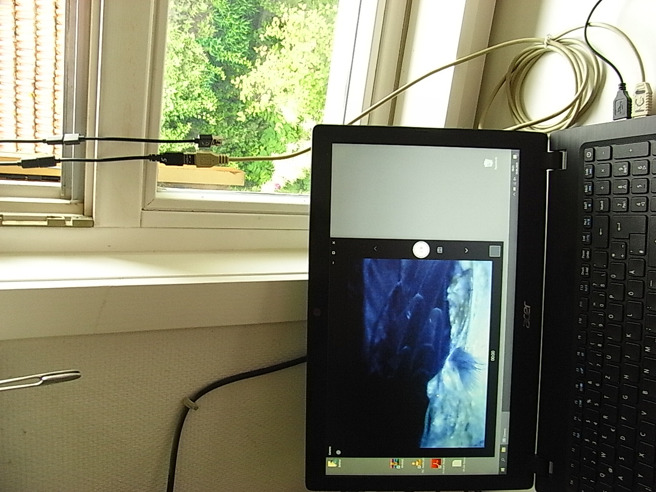 Hinter dem Fenster verbinde ich die Kamera (Kabel nummeriert) dann mit dem Laptop.