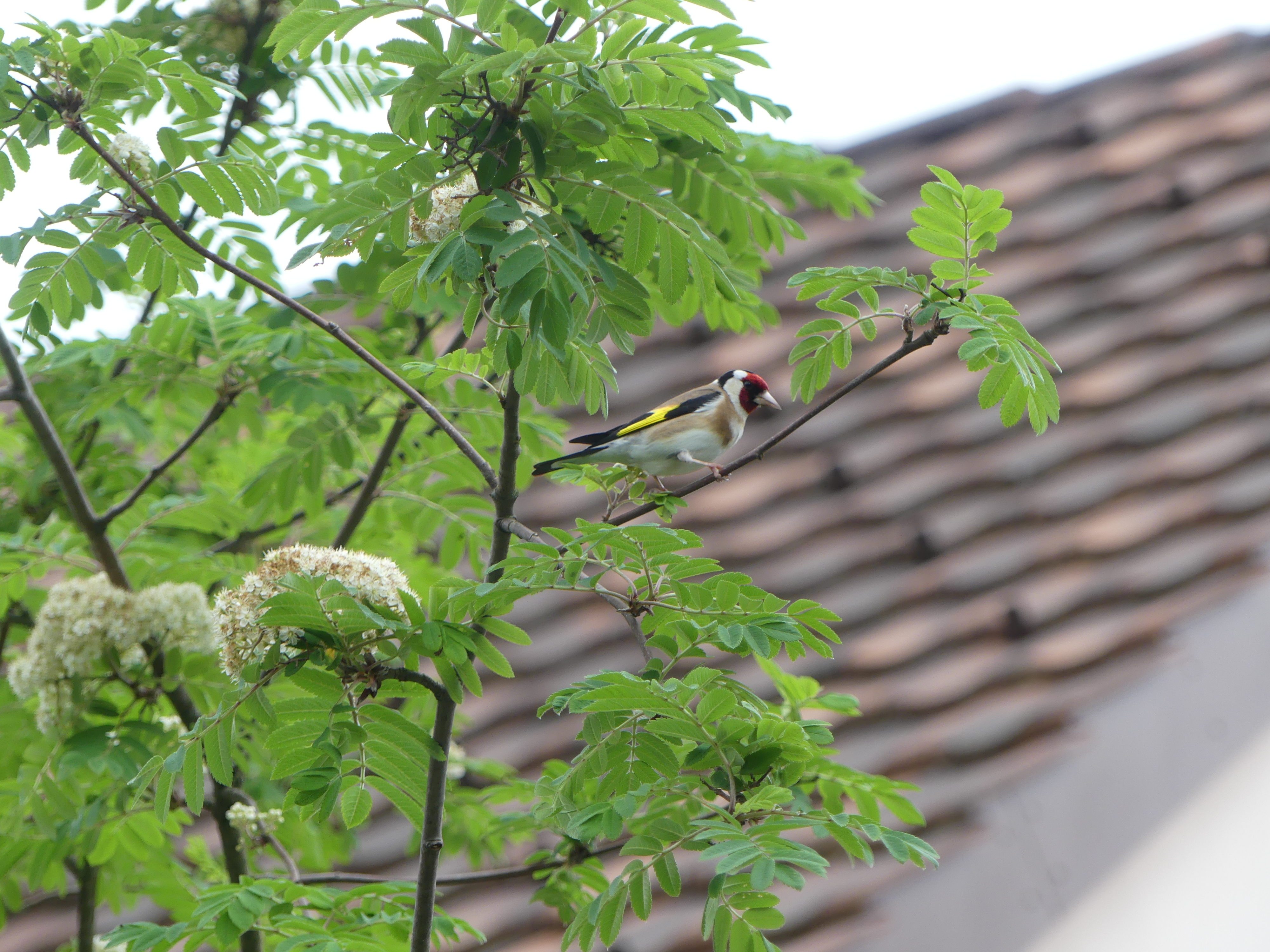 Vorgestern habe ich ganz oben im Fliederbusch ein kleines Nest entdeckt und nahm an, dass es von einem Stieglitzenpaar gebaut wurde. Heute früh wollte ich das genauer beobachten und entdeckte dabei ein Mönchsgrasmückenpaar in der Eberesche gleich neben dem Fliederbusch, das Männchen mit Nistmaterial im Schnabel. Kurz darauf konnte ich auf der gleichen Eberesche einen Stieglitz fotografieren. Aber gross war dann meine Enttäuschung, als das kleine Nest ein paar Stunden später heftigen Windböen nicht standhielt und zu Boden fiel.