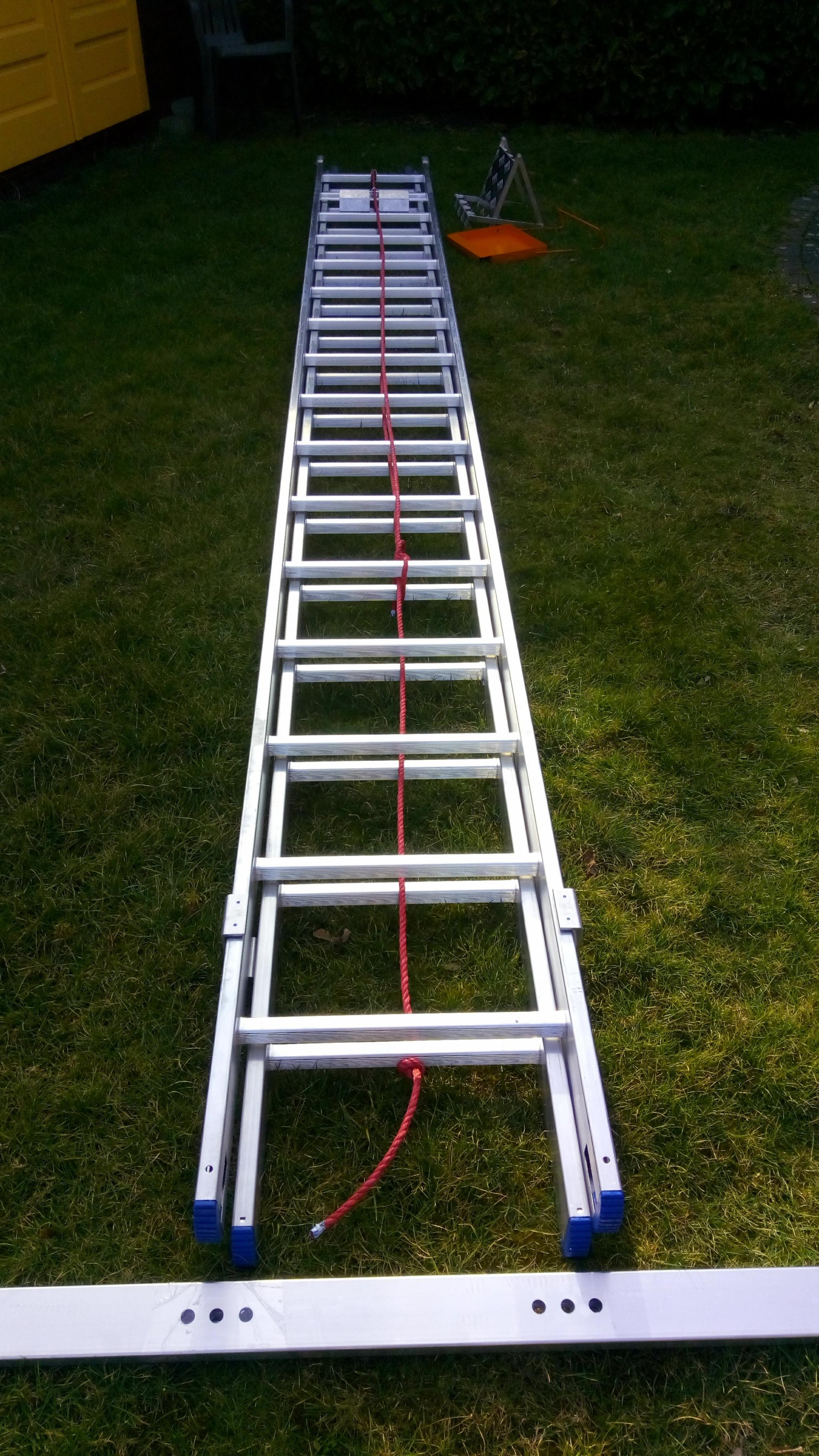 Zweiteilige Seilzugleiter mit Wandlaufrollen, mit 2x 16 Sprossen und ausgezogen 8m lang.