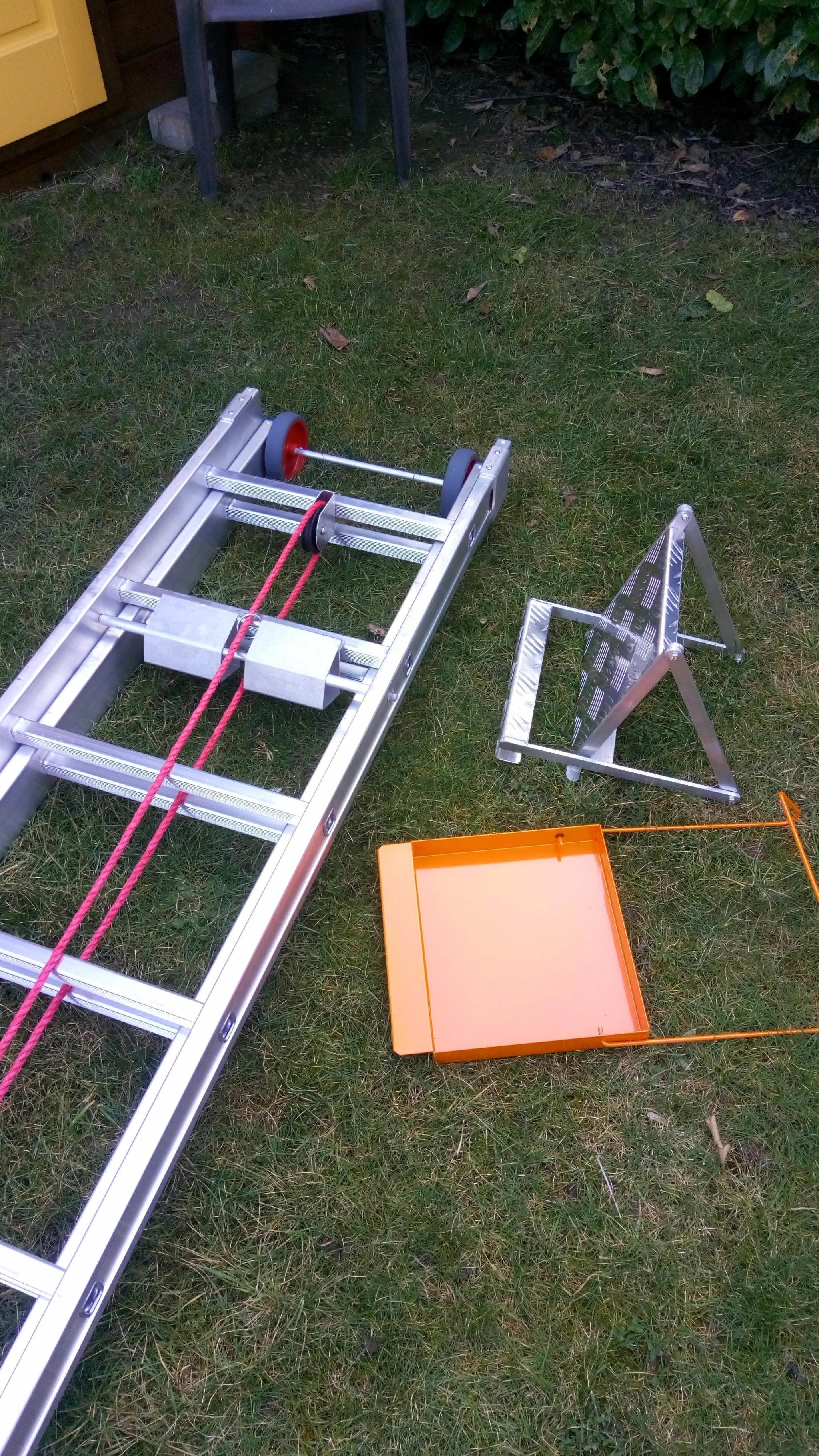 als auf der wackeligen Sprosse. Die beiden Teile waren als Frühjahrsbonus mit dabei. Zusätzlich habe ich mir dann noch einen Wandabstandshalter gegönnt, um das Ganze abzurunden. Die Leiter wiegt ohne Anbauteile 21,7Kg, was bei einer Länge von 32 Sprossen