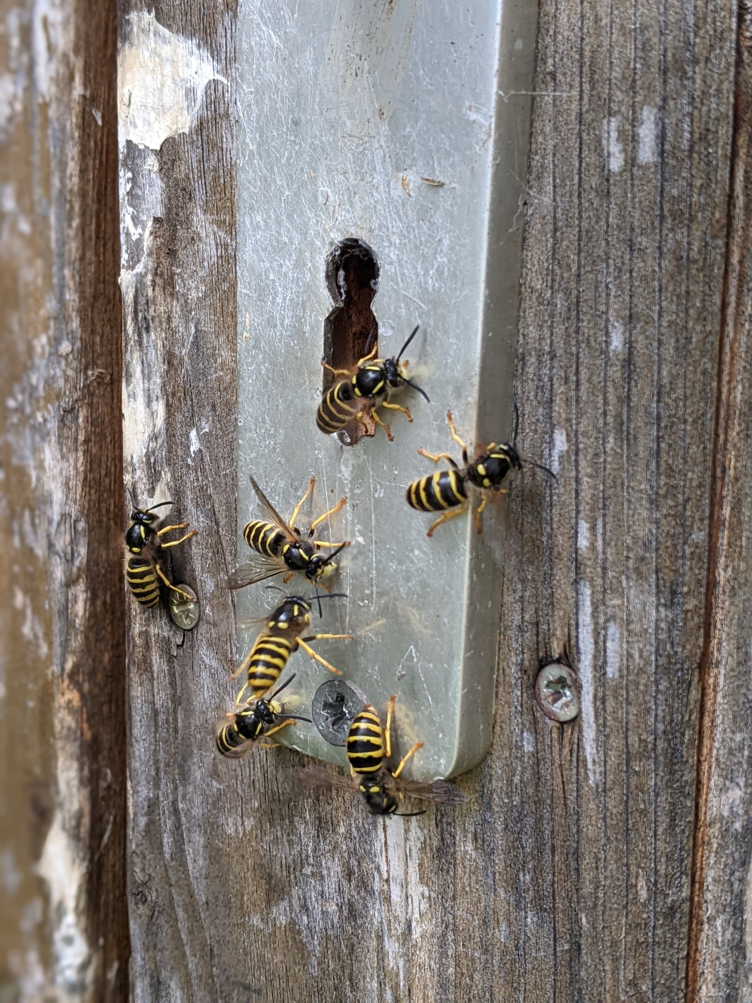 Die Wespen zeigen sich völlig unbeeindruckt, wenn ich die Türklinke betätige und den Schuppen betrete. Natürlich versuche ich dabei, hektische Bewegungen zu vermeiden. Sie fliegen dann nur etwas irritiert herum, da bei geöffneter Tür das Schlüsselloch nicht dort ist, wo sie es erwarten.