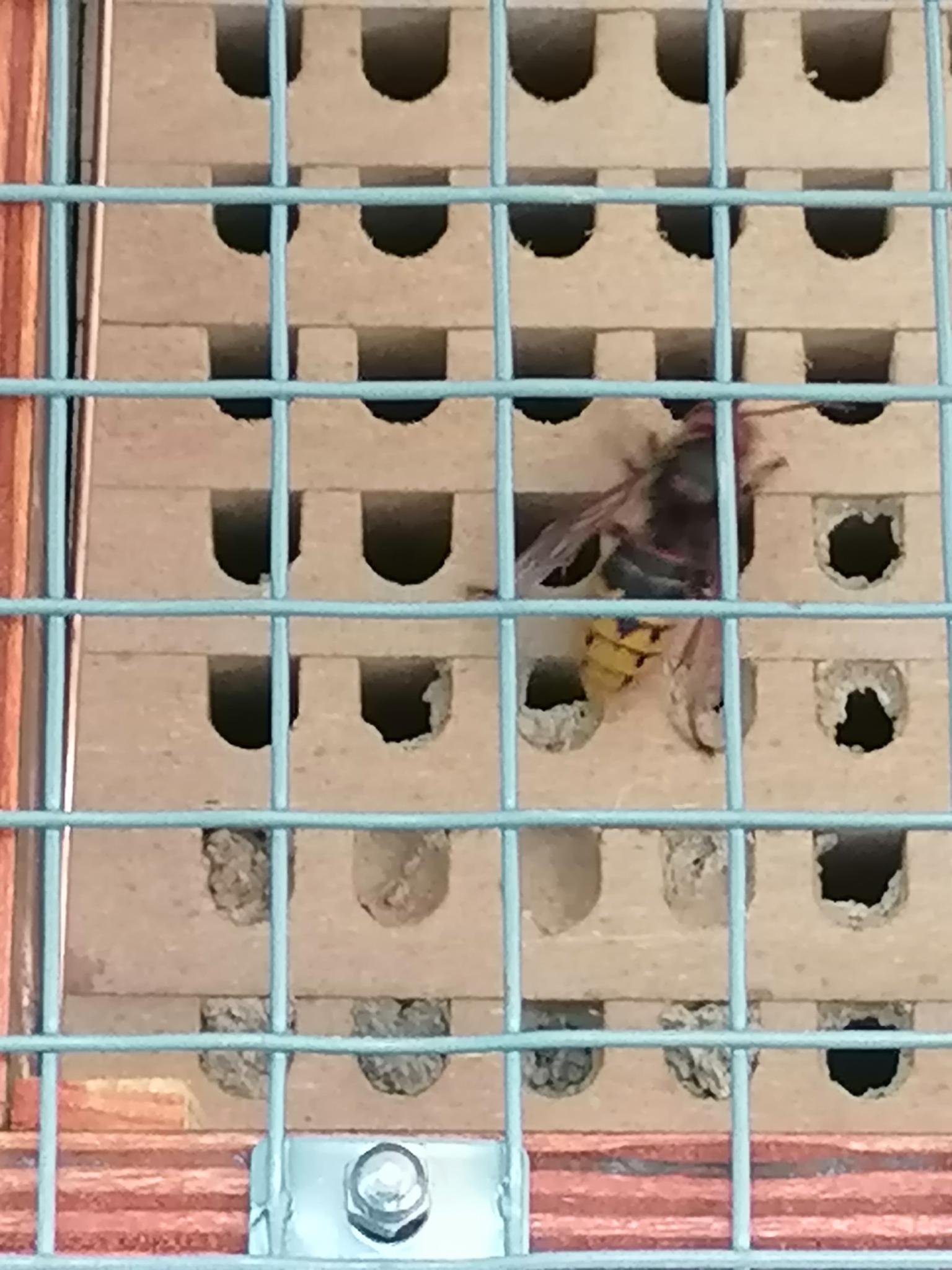 Doch vorhin war das Brummen ein anderes, als eine Hornisse zu dem Mauerbienen-Hotel flog und die Öffnungen untersuchte. Nun hoffe ich sie sucht sich einen anderen Platz.