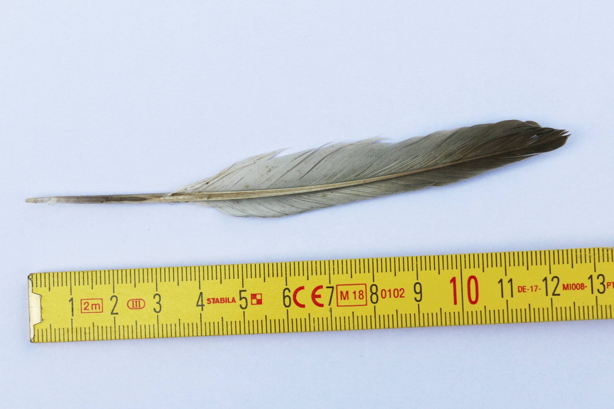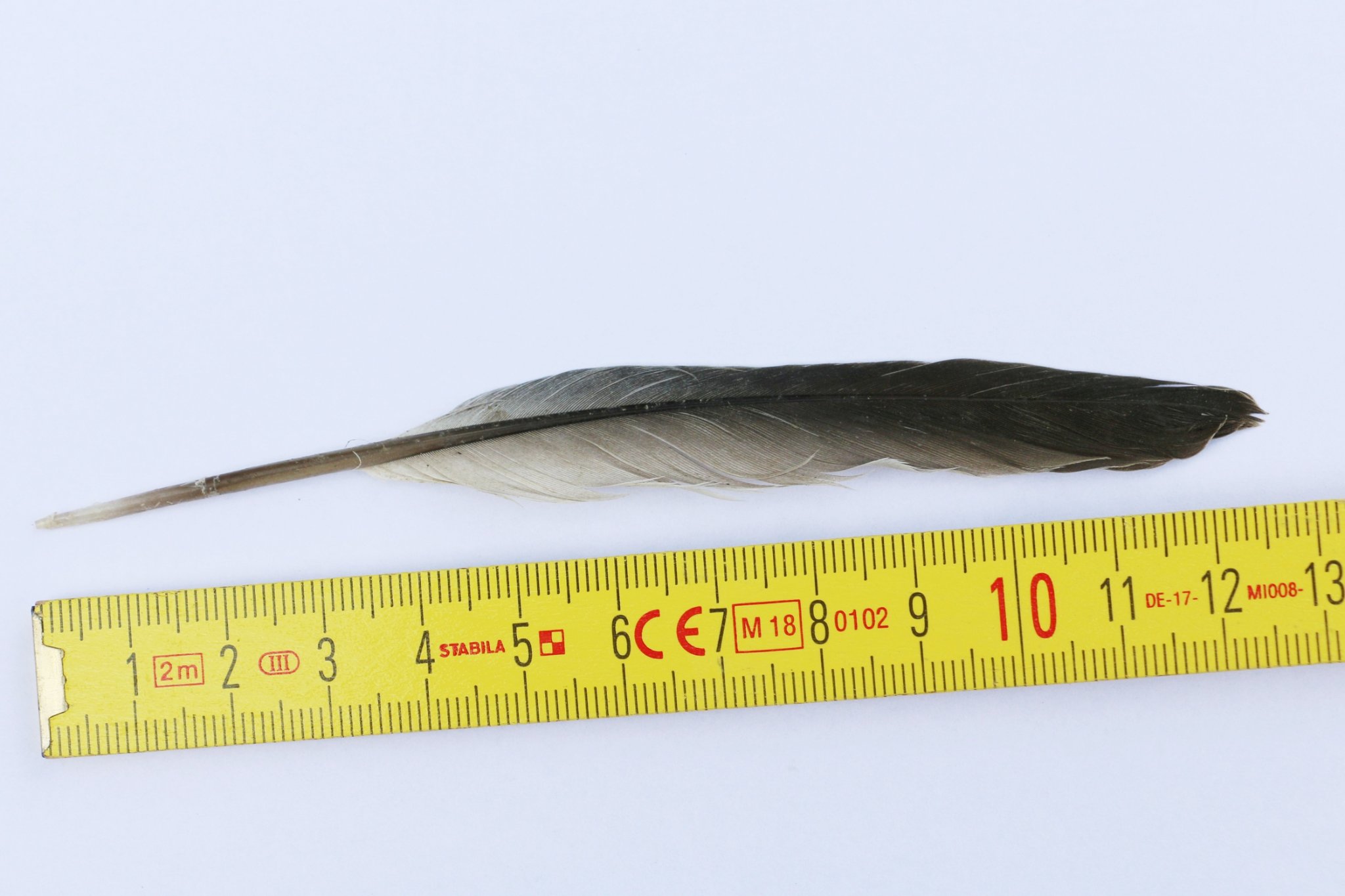 Oberseite: Unterseite: Rauchschwalbenfedern kenn ich, die sind ähnlich, aber viel zarter und kleiner. Bleibt eigentlich nur Mauersegler? Nachgeschaut - und nach featherbase https://www.featherbase.info/de/species/43 ist es wohl wirklich die 4. Handschwinge eines Mauerseglers