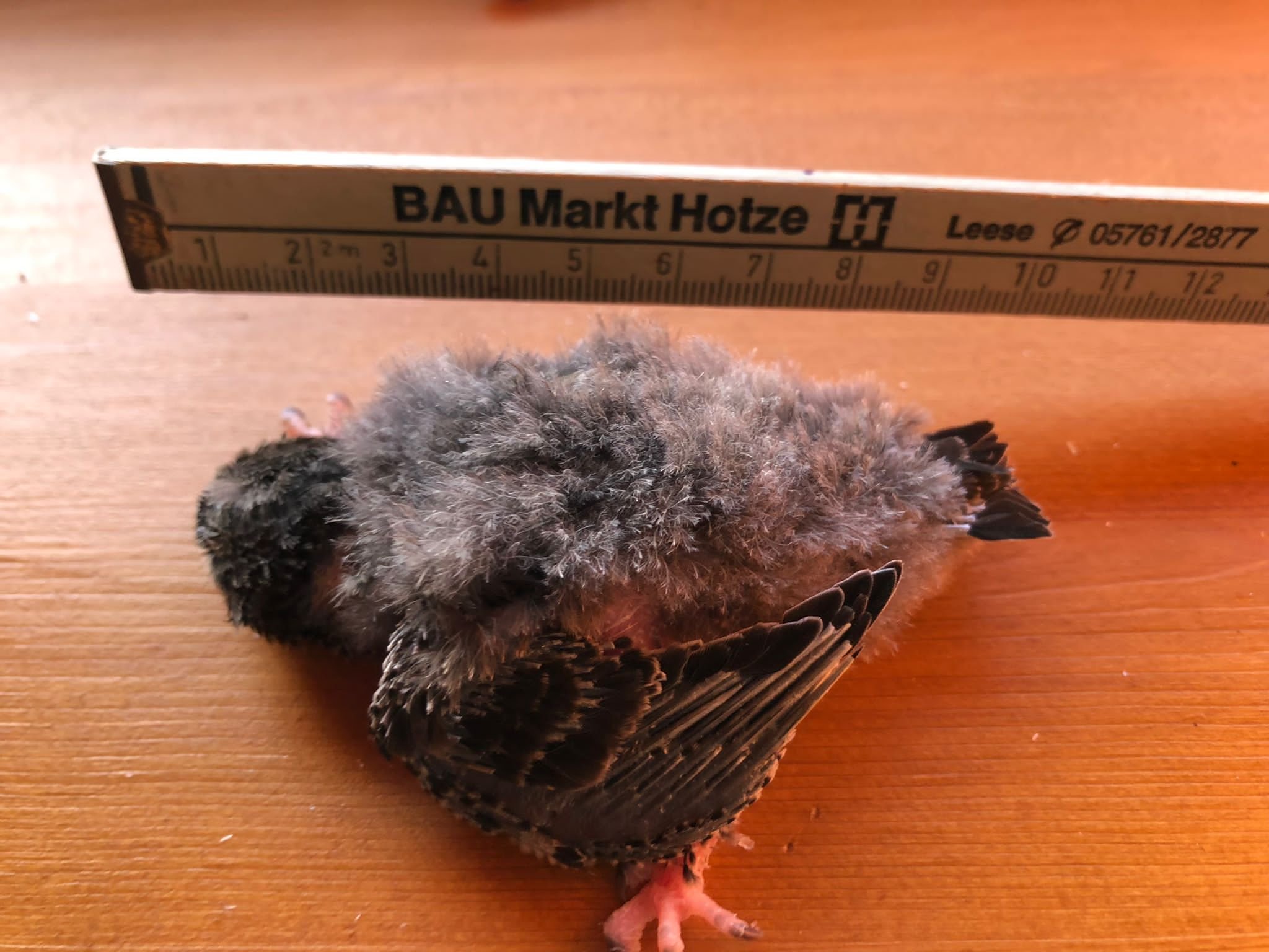Am 19. Juli 2022 habe ich das damals 4 Tage alte Küken aus dem Kasten genommen weil ich 43 Grad im Innern der Nisthilfe gemessen hatte und der Mauersegler sehr zu leiden schien