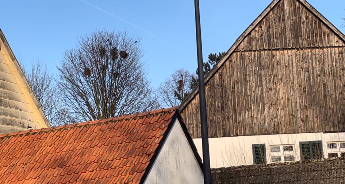 neulich konnte ich im Kreis Soest eine auf mehrere Bäume verteilte Saatkrähenkolonie beobachten .