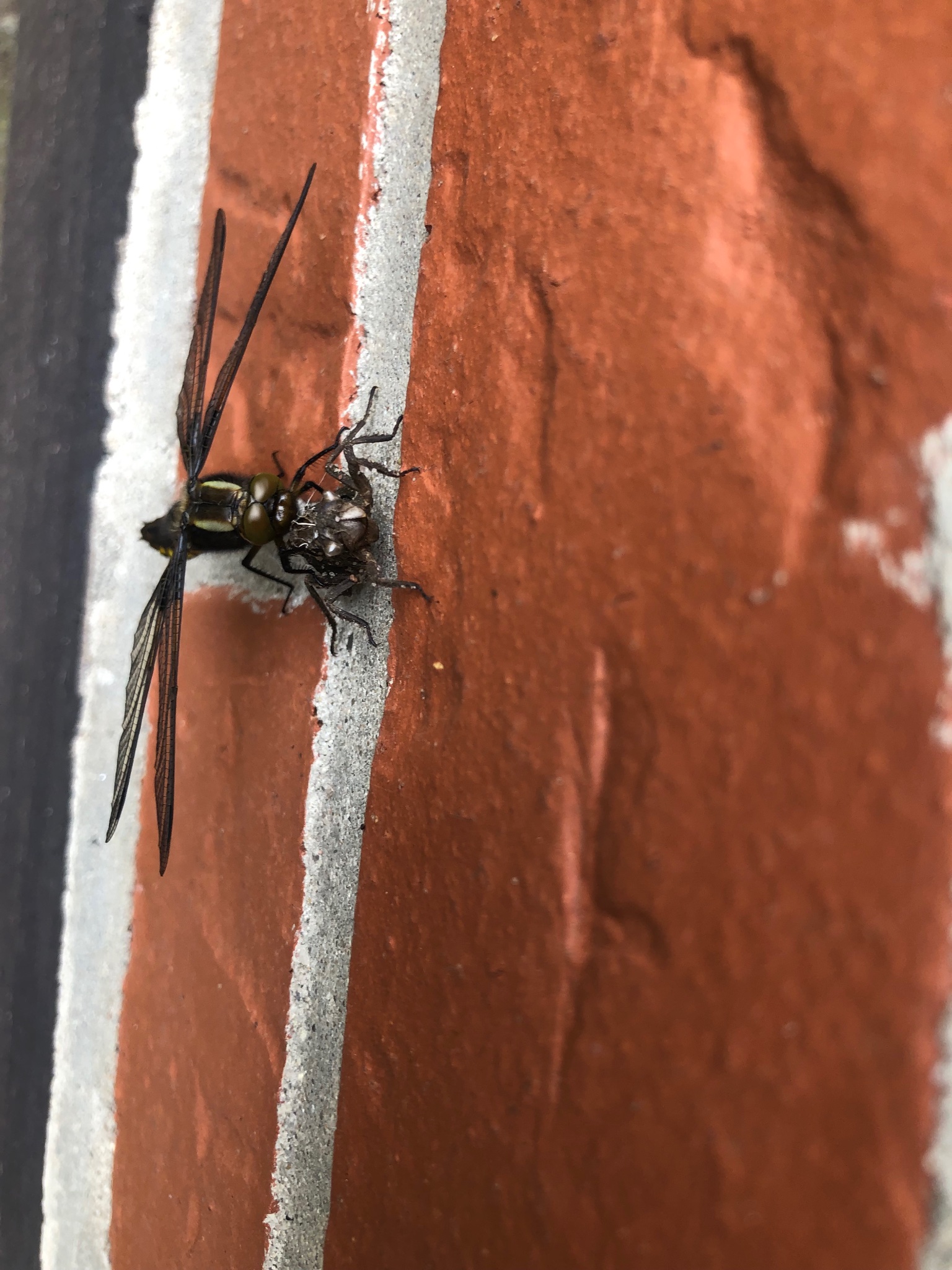 da dürfte eine Libellenlarve aus Eurem Teich an der Hauswand raufgeklettert sein, um sich zur fertigen Libelle zu häuten. Sie sitzt noch auf ihrer alten Hülle, vermutlich um die Flügel zu trocknen und damit auszuhärten.
