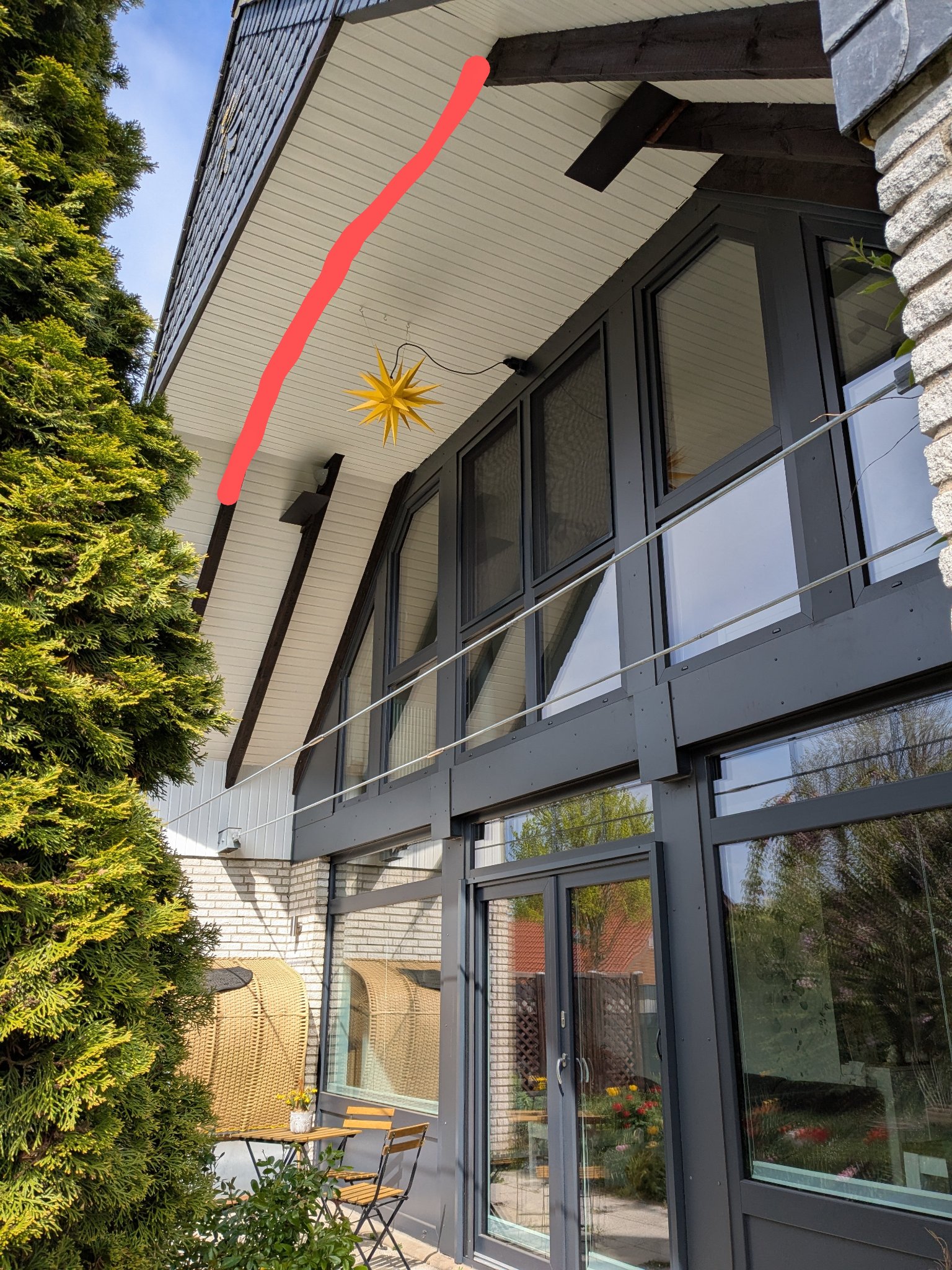 Ich würde die Kästen dann im Bereich der roten Linie anbringen. Die Kästen sind so dann auch vor der Sonneneinstrahlung geschützt.
