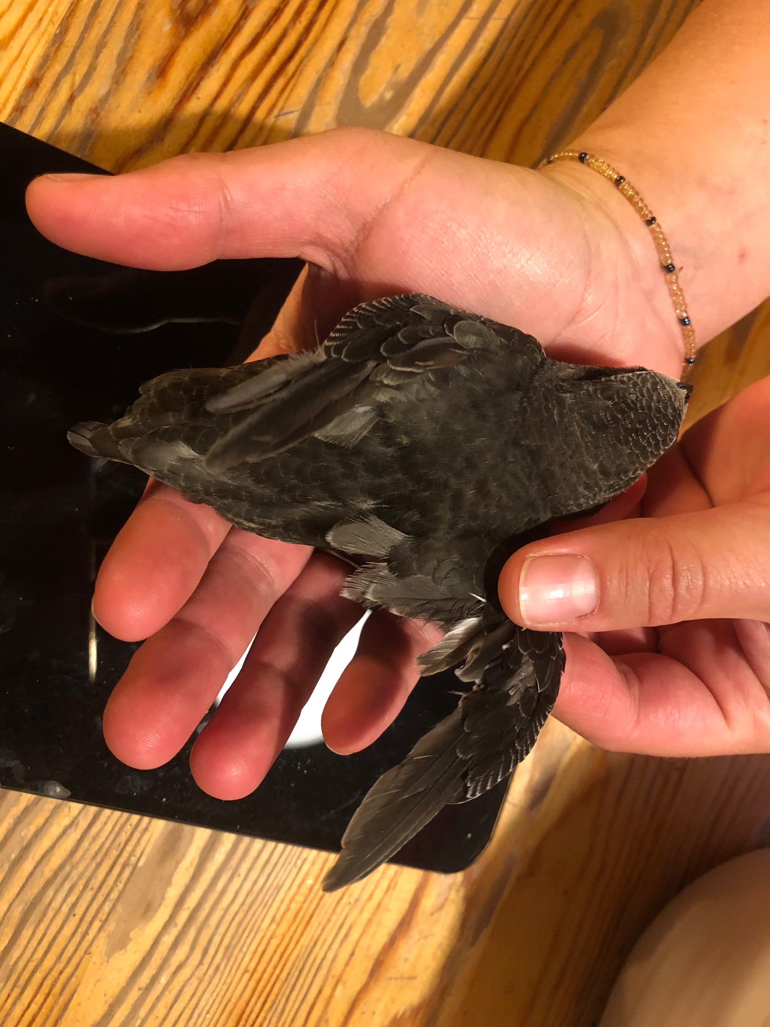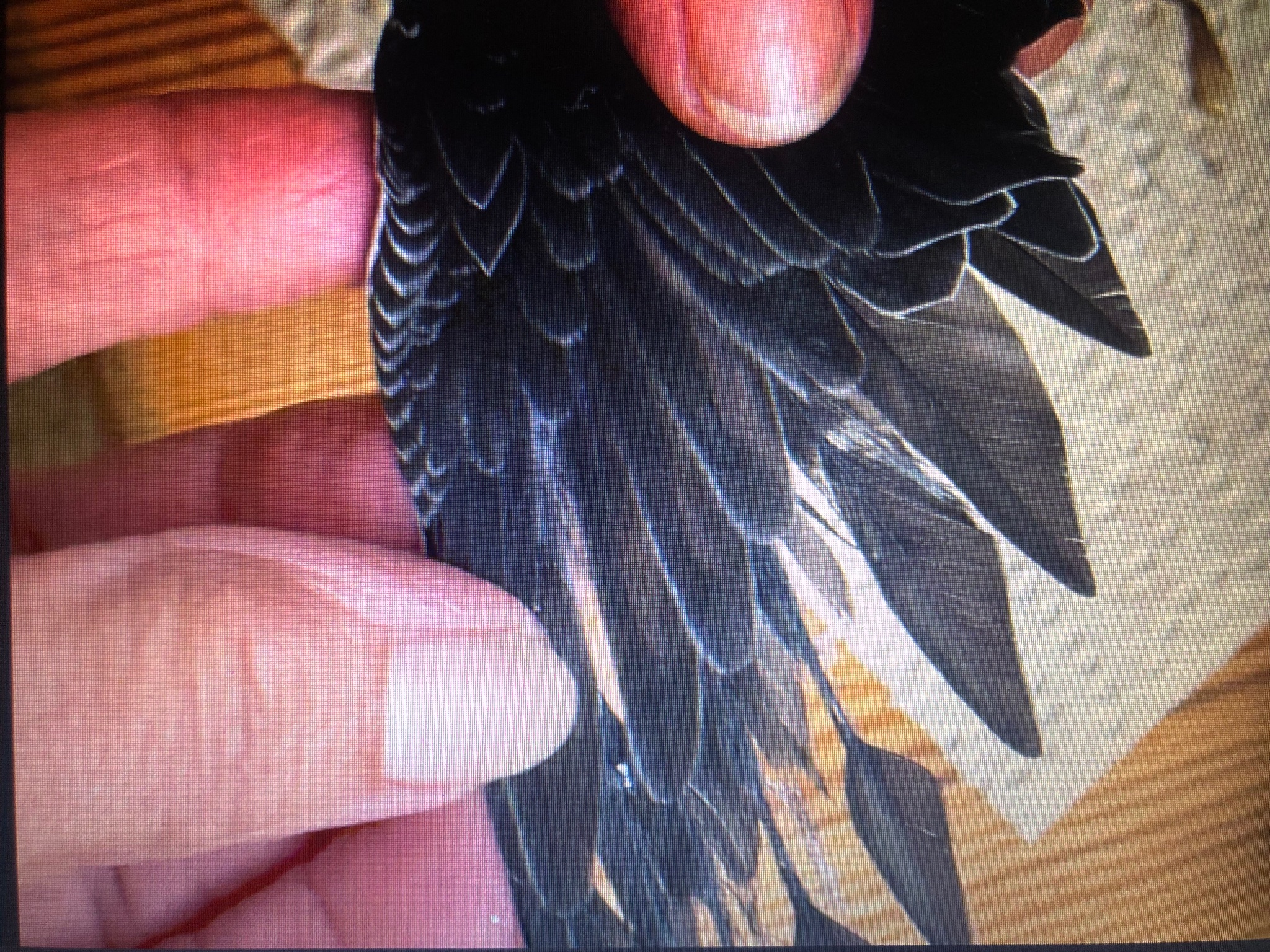 Diesen MS-JV bekam ich zur kurzen Fütterung und dann Auswilderung in einem geeigneten Nest. Als er hier ankam sahen die Federn ok aus aber schon am Folgetag bemerkte ich, dass die Federn nicht etwas, wie man annehmen könnte, verklebt waren, sondern abbrachen. Da ich diesen JV täglich fütterte wollte ich eine schnelle Entscheidung. Mit diesen Federn hätte er keine Überlebenschance gehabt und ich entschied mich dafür, ihn zum Tierarzt zu bringen wo er eingeschläfert wurde. Ich habe zu der Zeit vermutet, dass er falsch gefüttert wurde.