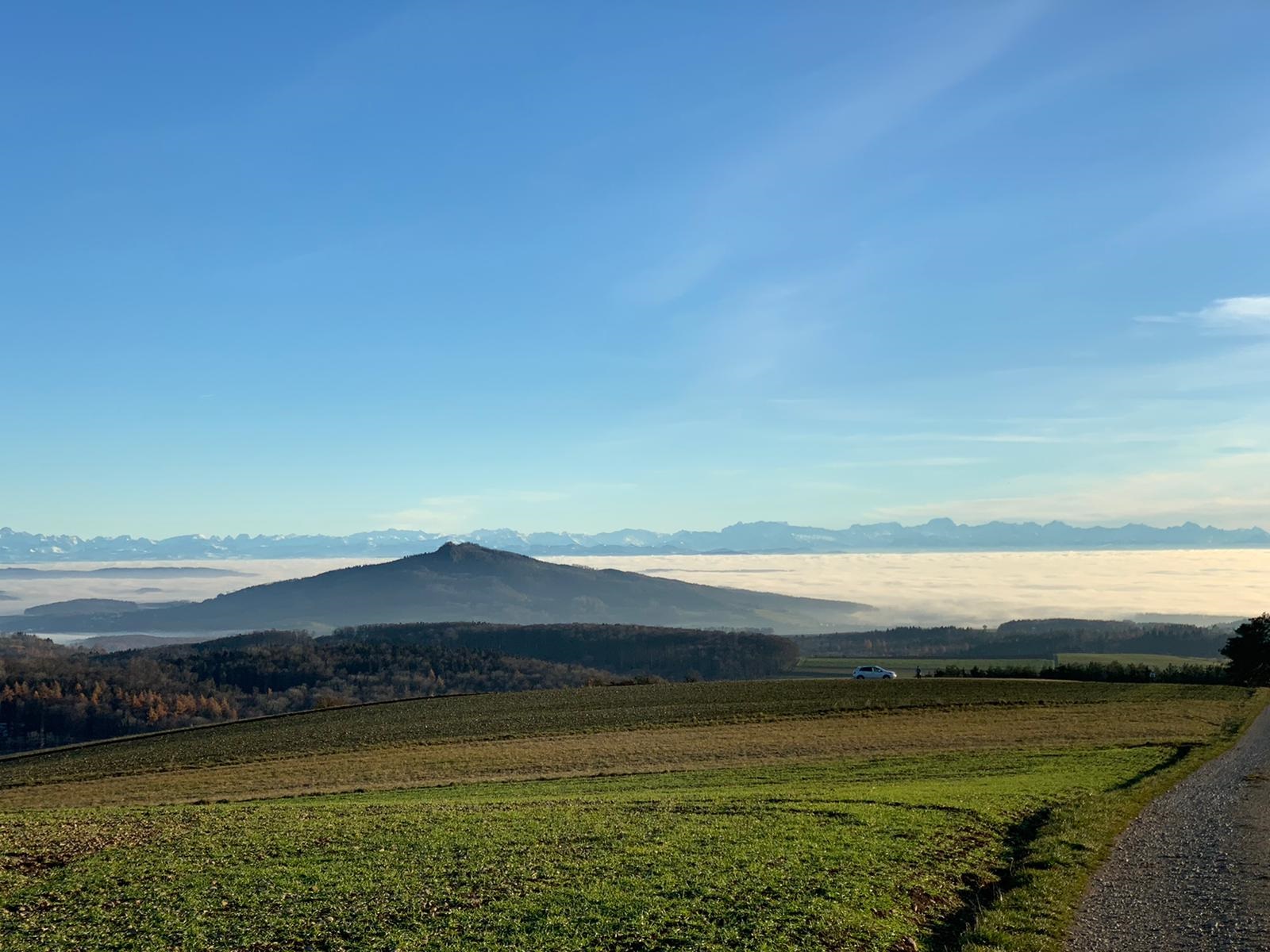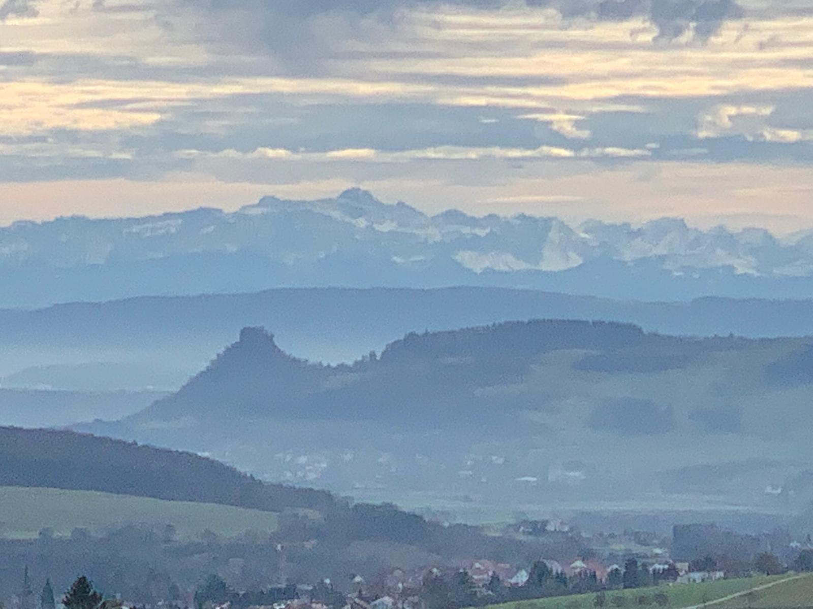 Falls hier übrigens doch einmal über längere Zeit dichter Nebel herrscht, sind wir in zwanzig Minuten auf dem Hotzenwald, dem südlichsten Teil des Schwarzwaldes, von wo wir Richtung Alpen eine ähnliche Sicht haben wie auf deinem Foto von Mittwoch (für uns wohltuender Seelenbalsam...)